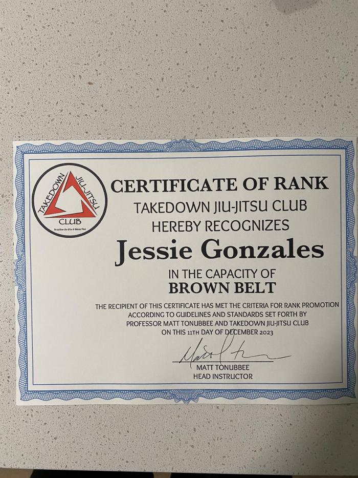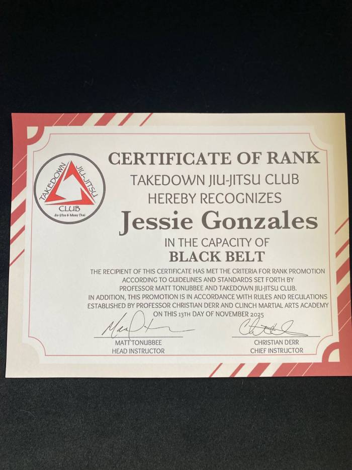 NOV 13 2025: Black Belt Cert from Prof Matt Tonubbee (my head instructor at Takedown Jiu-Jitsu) and Prof Christian Derr (Matt's head instructor from Clinch Martial Arts)