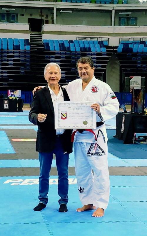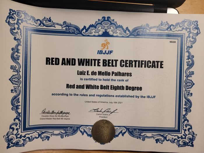 Currently I am 8th degree White and Red belt in Brazilian Jiu-Jitsu. I received my White and Red belt in 2018 by Grand Master Carlos Robson Gracie, Red Belt 9th Degree (President of the Jiu-Jitsu Federation of Rio de Janeiro).