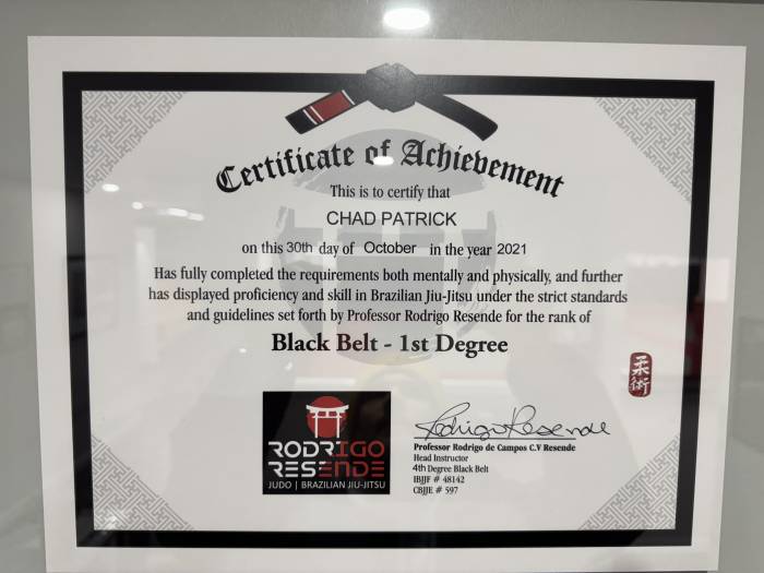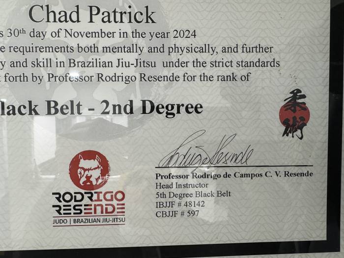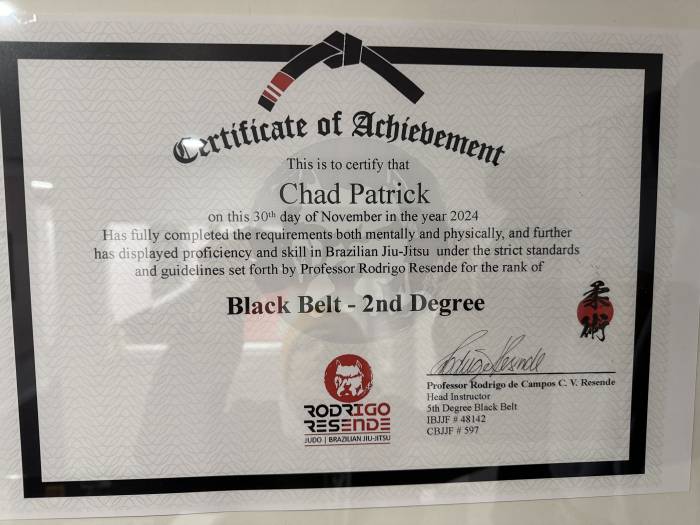 "Well documented time in each belt, as well as photographic evidence of promotions. Congrats on your second degree Professor."